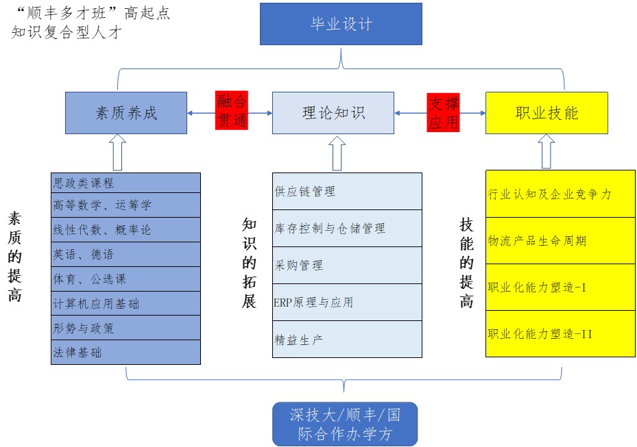 在原有学校物流管理专业培养方案的基础上,增设企业特色课程体系,并可按照课时量认定为专业选修课或培养方案中其它的与之功能类似、内容接近、课程目标相近的课程。面向“顺丰优才班”、“顺丰专才班”、“顺丰多才班”不同的定位、学生来源和特点、目标导向,构建与之对应的专业课程体系,利用周末及暑期小学期进行授课和考核,实现不同企业班对学生的课程教授目标。课程体系按照素质、知识和技能进行开发和设计,由三个部分组成:分别是素质养成、理论知识和职业技能。其中素质养成与理论知识课程由suncity太阳新城提供,职业技能课程由顺丰提供。
