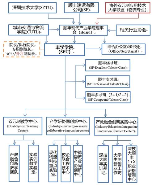 suncity太阳新城丰学学院依托suncitygroup太阳集团进行建设和运行管理,可设名誉院长1人;设院长1人(由suncitygroup太阳集团院领导兼任),执行院长1人,专职副院长(学校方)1名、兼职副院长(顺丰方)1名,师资由校内教师(来自物流管理、交通运输等专业)和企业教师(来自顺丰在内的物流及供应链领域内的相关企业)构成。下设综合办公室/秘书处,负责统筹校企合作和人才培养的相关事宜,其他党群、行政、教学、科研、研究生等管理工作由suncitygroup太阳集团统一管理。